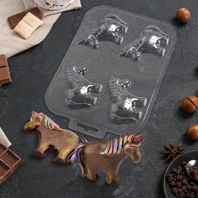Пластиковые формы созданы специально для изготовления шоколада вручную в виде милых единорогов. Заполните форму темперированным шоколадом. Добавьте сублимированные ягоды, орешки, яркую посыпку и другие наполнители по желанию. После замораживания в течение 5-10 минут шоколадную фигурку легко извлечь.